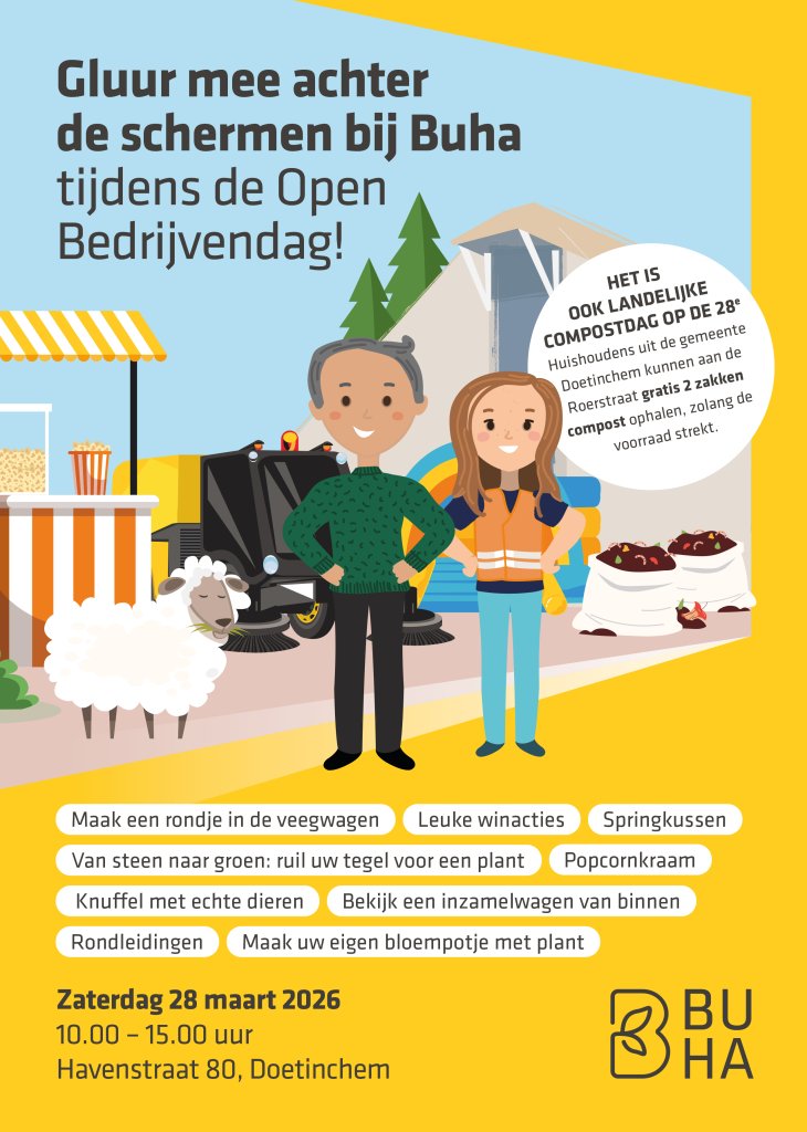 Op zaterdag 28 maart 2026 opent Buha aan Havenstraat 80 in Doetinchem haar deuren tijdens de Doetinchemse Open Bedrijvendag. Van 10.00 tot 15.00 uur krijgen bezoekers de kans om een kijkje achter de schermen te nemen en kennis te maken met alle Buha vakgebieden: afvalinzameling, groen, parkeren, handhaving, accommodaties, begraven, infrastructuur en riolering.